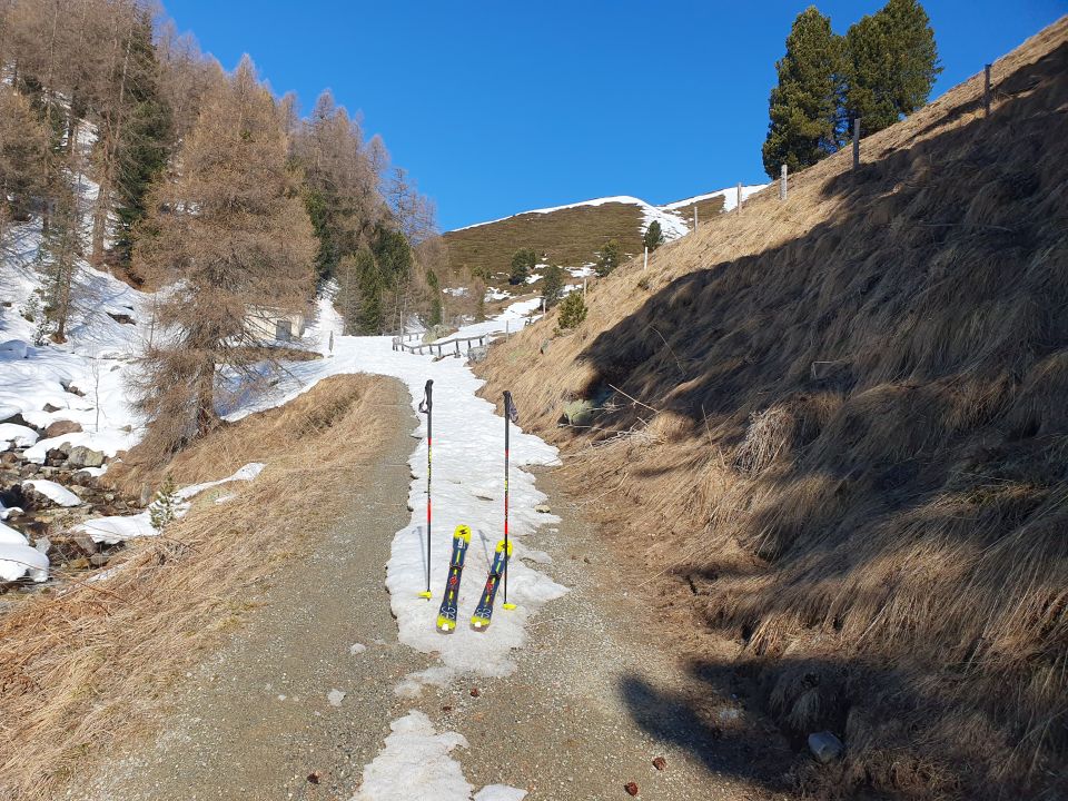 Der Aufstieg ab der Postauto Haltestelle Champfèr Guardalej dem Wanderweg entlang (oben keine Spuren gesichtet) hätte sicher noch etwas Schnee drinnen und wäre aktuell empfehlenswerter.