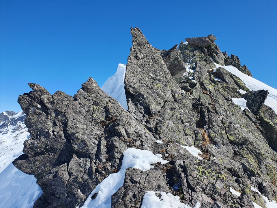 Ab der Fuorcla Güglia auf einer guten Spur SW-ausholend zum Skidepot. Ab hier einfach (ohne Steigeisen und Pickel) zu Fuss halb auf Schnee mit wenig Fels und über Schrofen zum Gipfel.