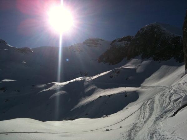 Abfahrt bis in den Sattel hart. Unterhalb Sattel mehrheitlich schöner Pulverschnee. Querung in den Hohtürlihang problemlos. Einfahrt in den Steilhang recht verfahren und hart. Hohtürlihang selber feinster Pulver, zum Teil etwas windgepresst. Ab Lerchböde pistenähnlich bis Griesalp. Strasse Griesalp - Tschingel schneebedeckt, zum Teil etwas eisig.