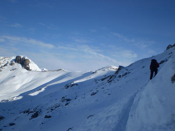 Triebschnee Ansammlungen, Teils Wind- und bruchharsch, nicht lohnende Abfahrt. Kalt!