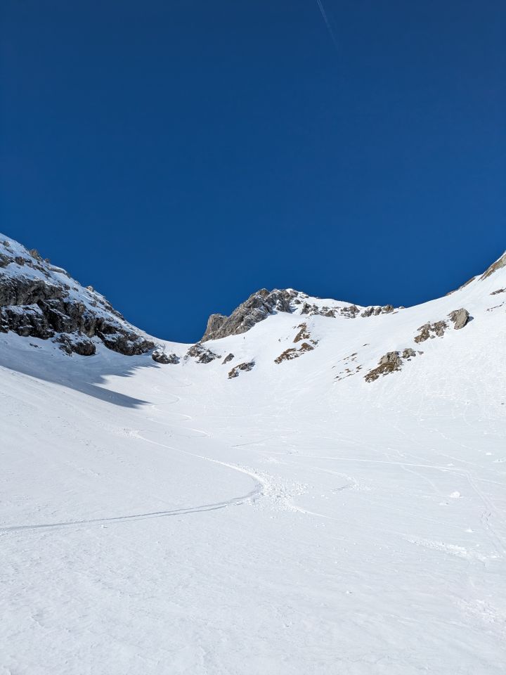 Morgens um 7 sind wir los. Vom Parkplatz bis auf kurzer Stücke direkt mit Skiern. Über die erste Steilstufe links, dort war der Schnee noch hart gefroren. Der Gipfelhang war dann schon ziemlich weich, weshalb wir auch nur bis zum Ski Depot sind. Die Abfahrt war dann im oberen Teil mit teils pulvrigem, teils firnigem Schnee richtig gut. Dann gab's mal Bruchharsch vom feinsten und unten nochmal einfach hart.
