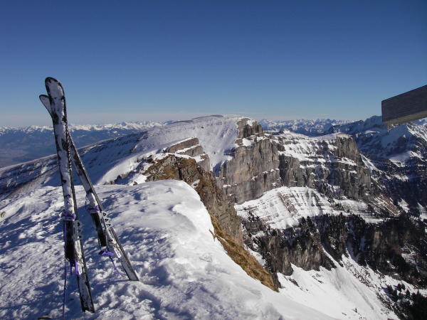 da wenig Schnee im Tal über Kunstschnee der Skipiste aufgestiegen. Ab Sellamatt genug Schnee. Gipfelflanke z.T. verharscht, tls. eisig, tls. windgepresst.