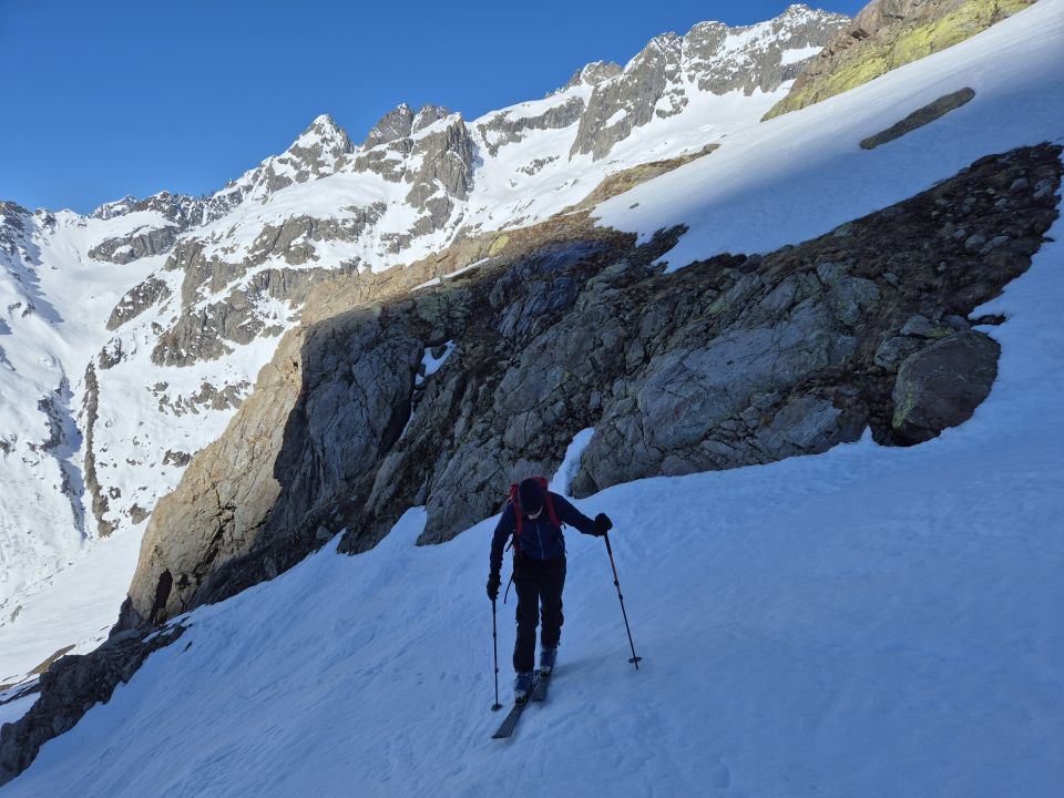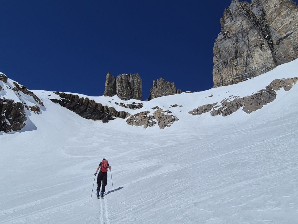 Am Morgen mit Harscheisen Aufstieg. Abfahrt bei Sulzschnee, wobei die Sulzschneedecke schon stark aufgeweicht war. Wir hätten eine Stunde früher die Abfahrt angehen sollen.