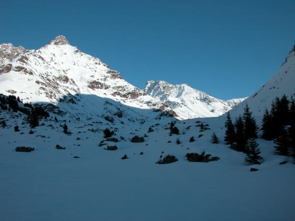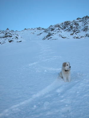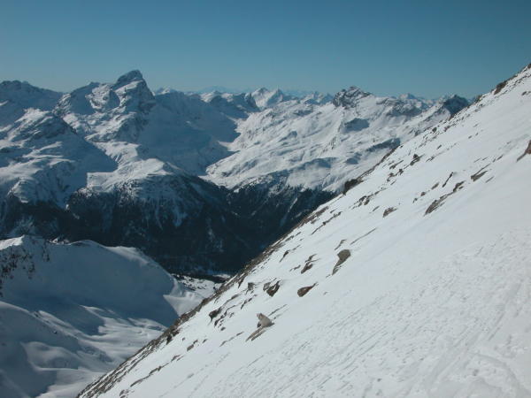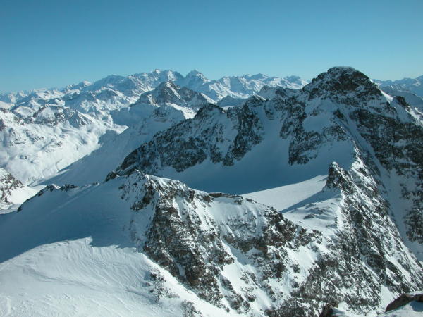 Abfahrt: Gletscher gut eingeschneit. In der weiten Mulde angezogener Pulver. Ab Talboden Spur (Stöckeln bis ca. Alp d'Err). Strasse bis ca. 1500m fahrbar, dann kurze Tragpassage bis Tinizong.