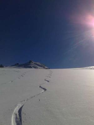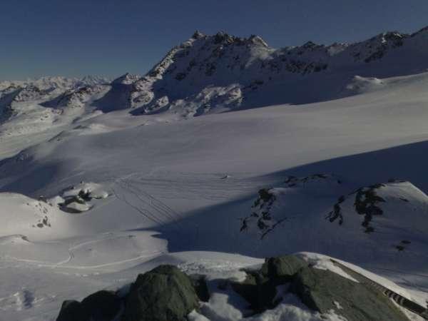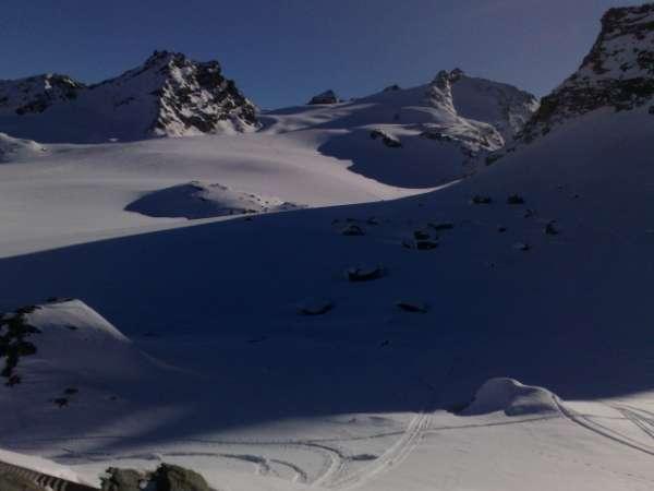 In den schattseitigen Hängen aufbauend umgewandelter Lockerschnee, sonnseitig hart. Auf dem Gletscher weicher Triebschnee. Ab Lac de Grand Désert flächig eingefahrene Hänge (Buckelpiste). Unter Stausee Le Cleuson hart, z.T. eishart gefroren.