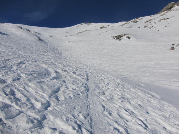 Hart, ganz oben noch etwas Pulver. Sozusagen alle Hänge sind verfahren. Zwischendurch ein paar Steine.