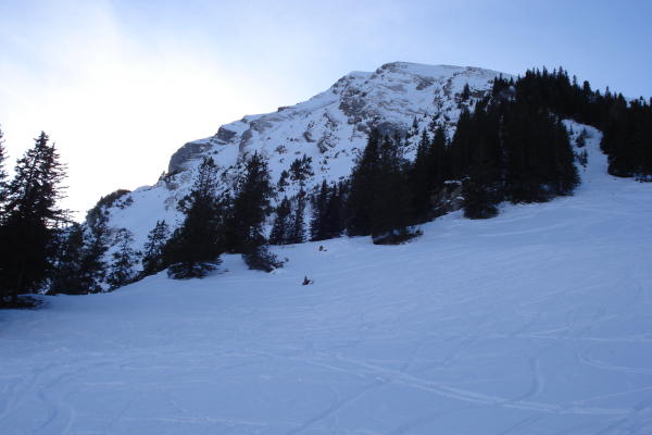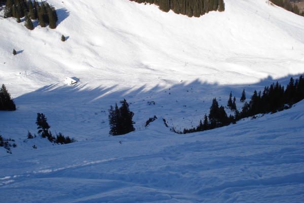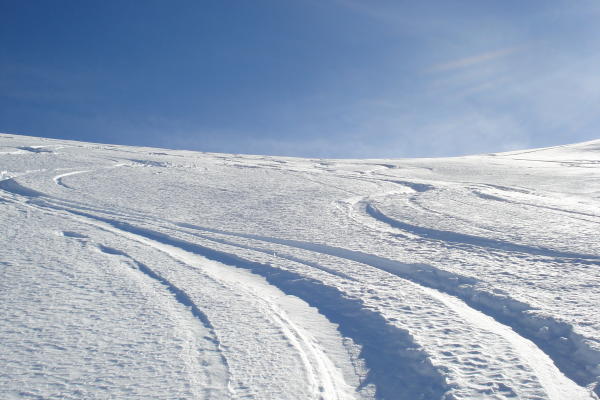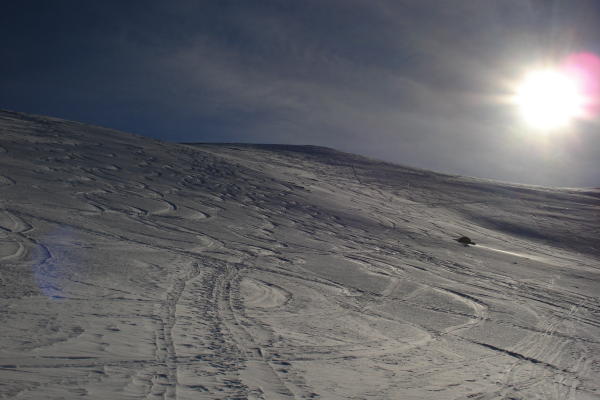 Gute Schneeverhältnisse, im oberen Drittel noch Pulver vom feinsten, im Zwischenteil etwas Windharst, aber gut zum fahren. Trotz vielen Spuren der letzten Tage weiterhin lohnend.
