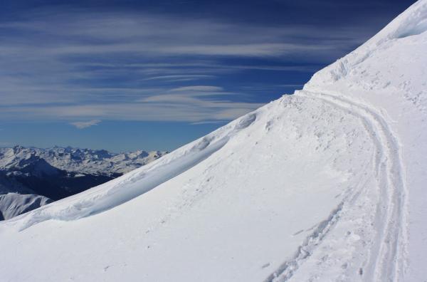 Das Älplihorn ist ein beliebter Ski-3000er, so war eine perfekte Aufstiegsspur durchs Bärentälli vorhanden und als logisches Fazit unzählige Abfahrtsspuren das Mitteltälli hinunter. Der Aufstieg und die Besteigung des höchsten Punktes war der reinste Genuss, jedoch hielten sich die Abfahrtsfreuden in Grenzen. Wegen Steinen fuhr ich erst etwas vom Skidepot den Mitteltälligrat bis auf zirka 2800m ab, danach war der Steilhang (bis 35°) hinunter ins Mitteltälli gut zu fahren obwohl es manchmal auch dort unter dem Pulverschnee kratzte. Von 2500m im Miteltälli bis hinunter auf 2100m unterhalb Fanezmeder wurde es zusehends mühsam denn schwwerer Schnee und Bruchharst wechselten sich regelmässig ab. Die weiter Abfahrt nach Monstein über ein vereistes, enges Weglein war zum Schluss auch nicht der Knüller.