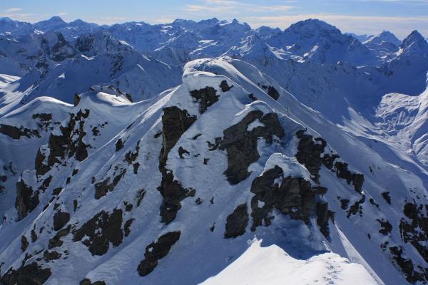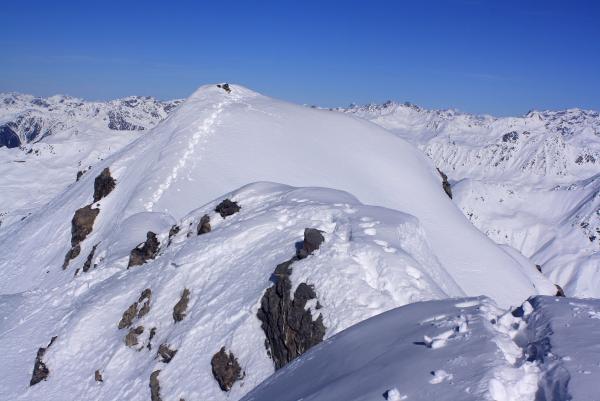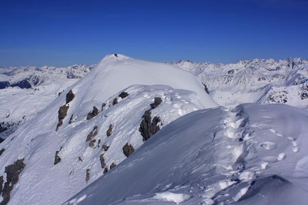 Interessant war jedoch bei der Tour der eher alpinistische Aufstieg zum höchste Punkt welcher noch keine Spur aufwies. Vom Skidepot folgt man dem Grat bis zum Vorgipfel, danach muss man eine kleine Stelle abklettern (Fels I) um auf die Kuppe unmittebar vor dem etwa 1 bis 2 Meter höheren Hauptgipfel mit dem Steinmännchen zu gelangen. Hier endeten die Spuren und der Hauptgipfel erschien noch jungfräulich. Ich folgte zuerst dem Grat und kletterte dann bei einer ersten senkrechten Felsstufe westseitig ab und konnte sie so umgehen, der Fels hat übrigens gute Griffe. Nach eienm kurzen Gratstück folgt ein weiterer Fels oberhalb einer kleinen Scharte. Dieser Fels ist überhängend, doch hat er gute Griffe und auch einige versteckte Tritte. Mit etwas Akrobatik und Krafteinsatz kann man sich daran hinunter lassen wobei man ihn im Sommer in der Flanke (I-II) umgehen kann. Von der Scharte gelangt man mühelos zum höchsten Punkt.