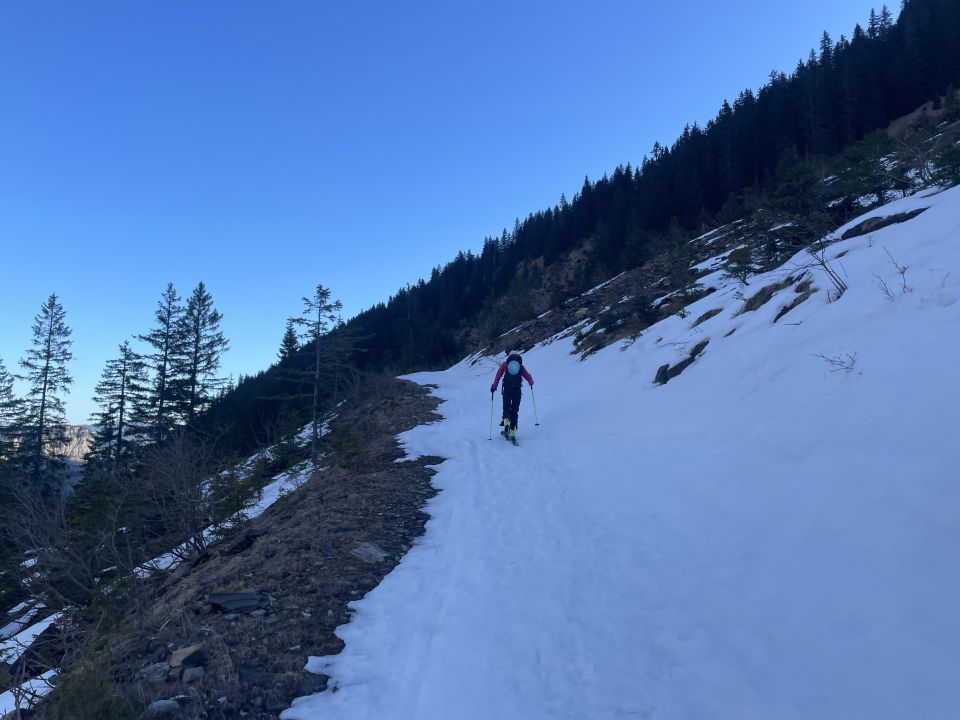 Es hatte heute früh noch etwas Wind drinnen, so waren wir mit der Abfahrt um 10:30 zu früh für Sulz, daher eher Pistenfeeling, selbst am rechten Ende des Hangs. Unterhalb der Alp kurz sogar brüchiger Schnee, dann sulziger auf der Fahrstrasse.