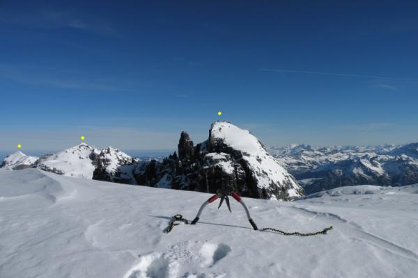 Im Gebiet Rossfirn/Juzfad schon Deckel und Windgepresstem Schnee, nur noch wenig pulveriges getroffen. Querung vom Chüefadpass zum Spannortjoch mit Harscheisen auf Windgepresstem hartem Schnee sowie der aufstieg zur Nordflanke.