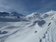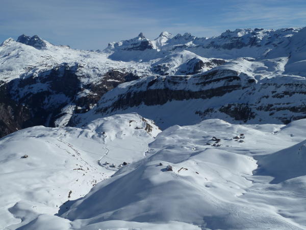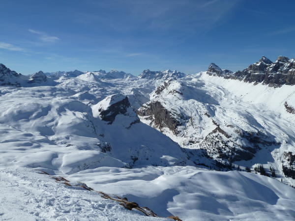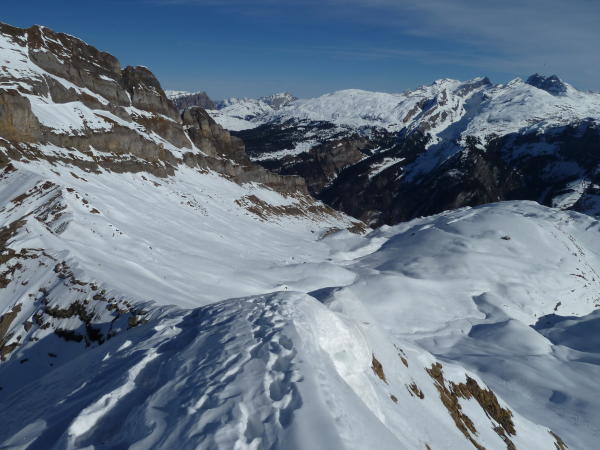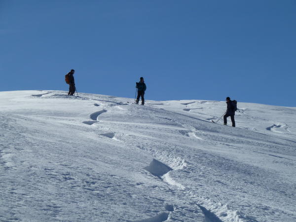 Der Aufstieg der Forststrasse entlang ist mit gutem und genügend Schnee eingedeckt. Oberhalb dem Stäfeli haben wir sehr schöne Pulverschneehänge gefunden. Das Wetter zeigte sich von der angenehmsten Seite mit der Wärme wie sonst im Mai. Es hatte sehr wenige Leute in diesem Gebiet unterwegs.