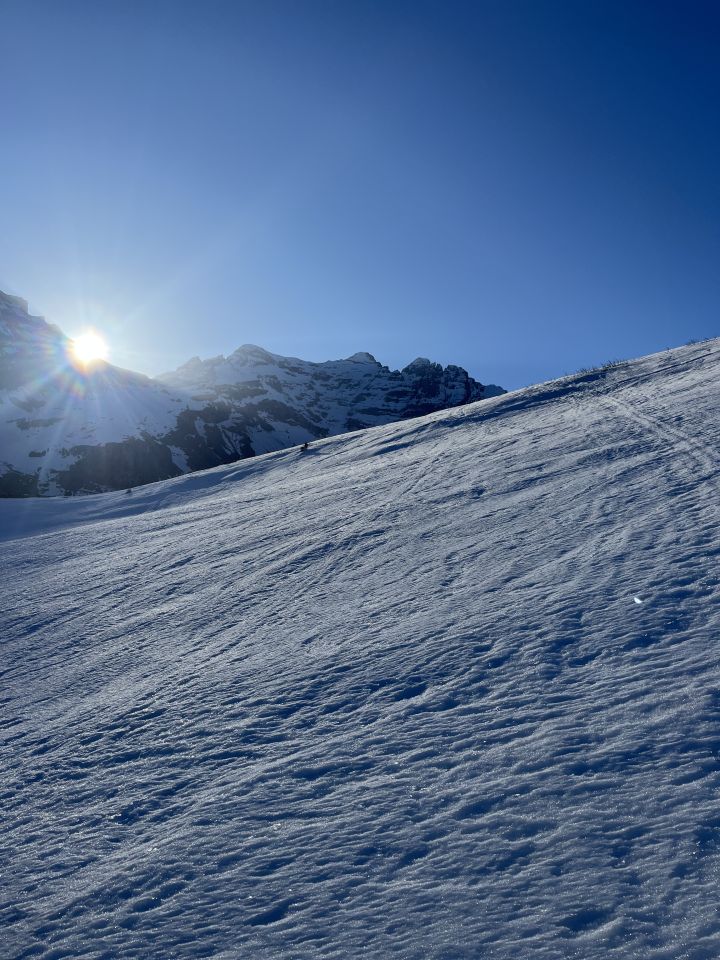 Abfahrt um 11.30 Uhr Richtung Bärentritt kurz in pulverählichem Schnee. Dann jedoch in die Sulz/Nassschneehänge ostwärts gequert. Das skifahrerische Highligth waren dann die Hänge unterhalb 2100 bis zur unteren Bundalp in teils seidenfeinem Sulzschnee. Über Strässchen mit kleinen Abkürzungen und mehrmaligem kurzen Ski tragen zurück auf die Griesalp.