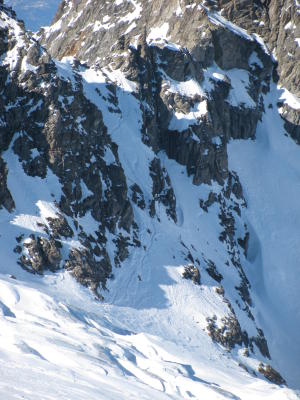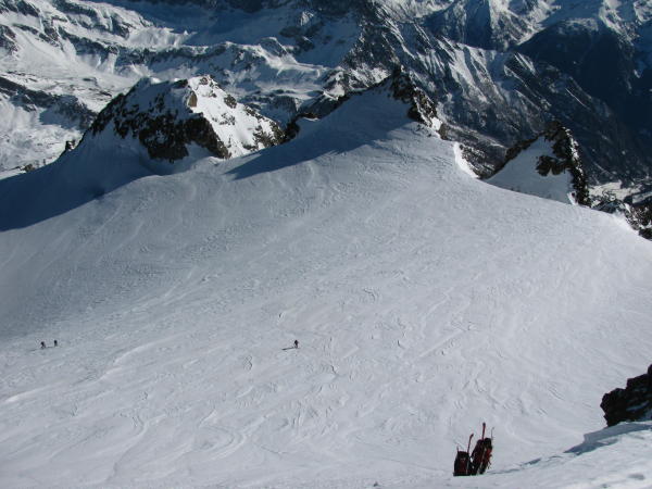 Meist windgepresst oder hart auf Gletscher (Harscheisen im Aufstieg z.T. hilfreich). Spalten gut überblickbar und umgehbar. In der Abfahrt unterhalb 3000m noch pulvrig bis 2400m, dann Frühlingsschnee. 15m Zusatzportage im Aufstieg auf 3700m um auf dem Dôme auszusteigen (steil und schlecht tragende Schneeoberfläche). Ketten am Gouille-Pass zu ca. 75% aufgegraben - problemlos passierbar beidseits. Wir konnten noch ohne Tragpassage bis Bourg St.Pierre abfahren, wird aber mit den Temperaturen in den kommen Tagen < 2000m schwierig...