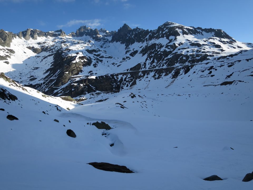 Wir haben auf ca. 1850 m Richtung Osten bis zum Bach unterhalb der Strasse traversiert und mussten die Felle nicht mehr montieren. Trotz des schlechten Schnees war es eine sehr coole Tour.