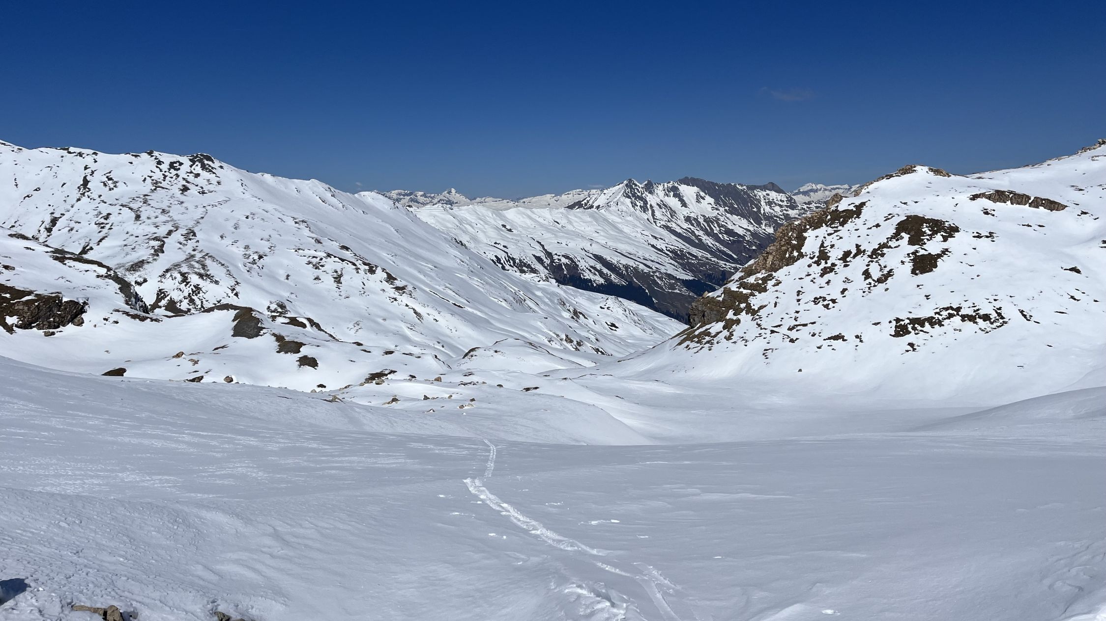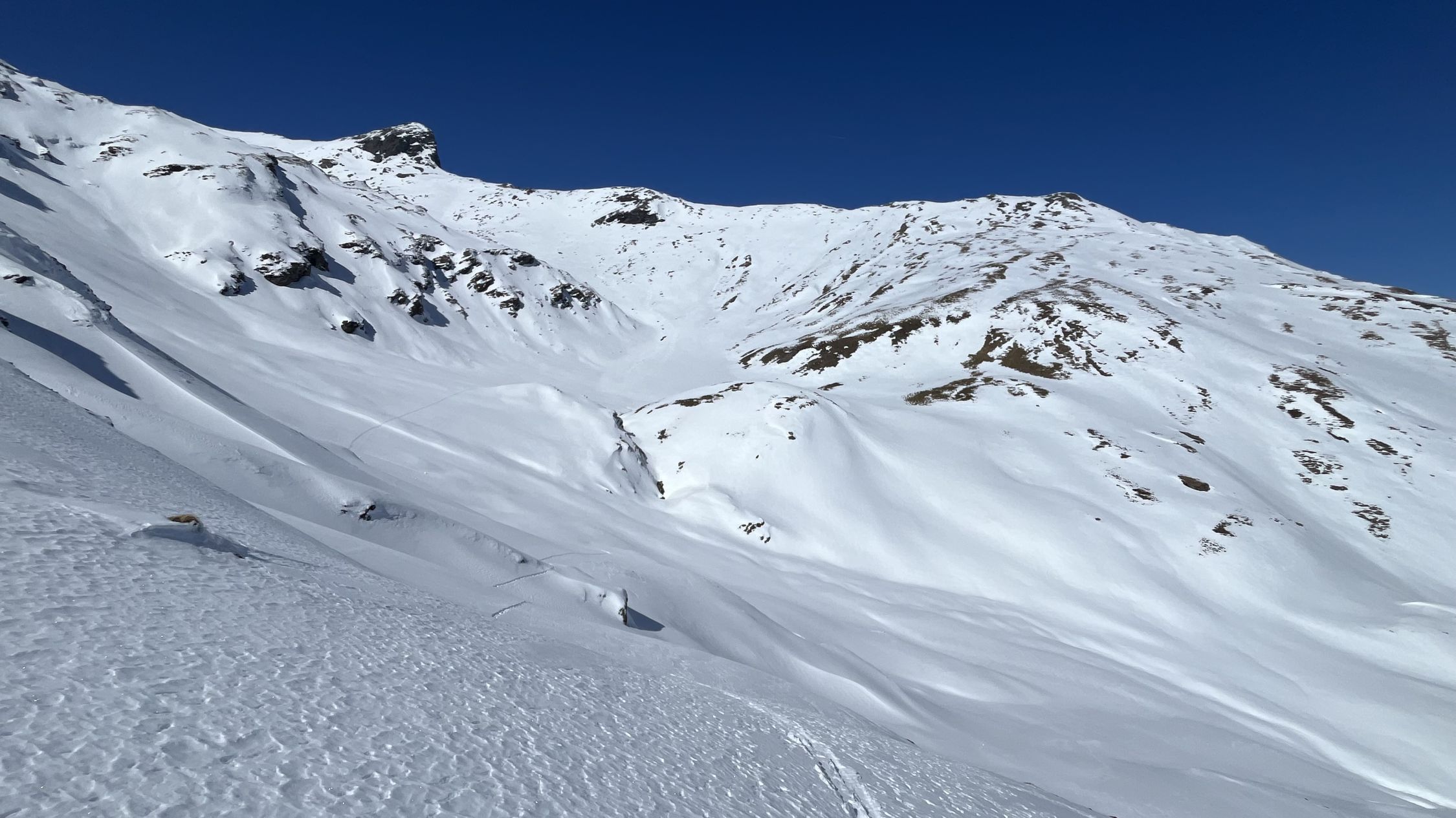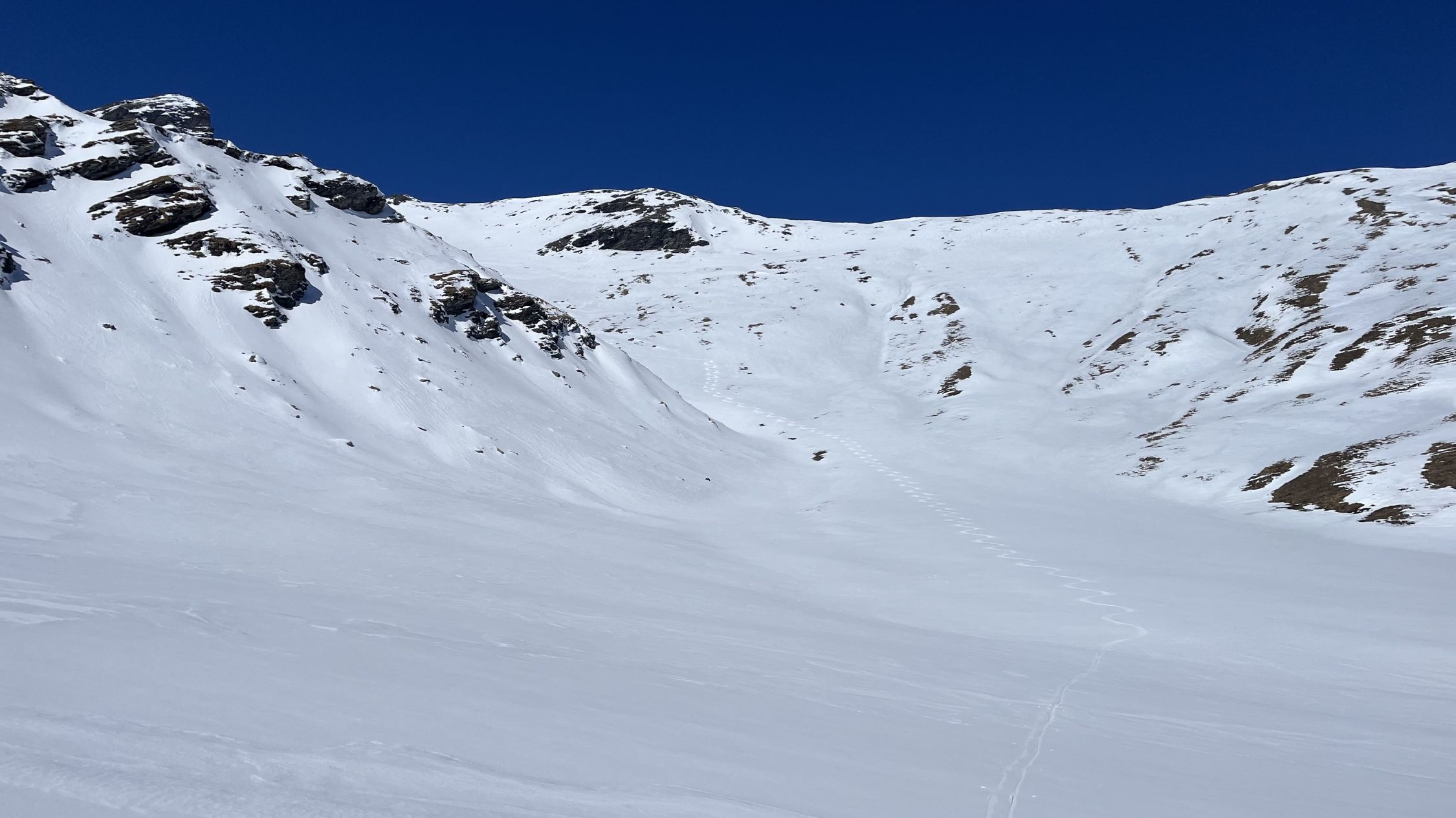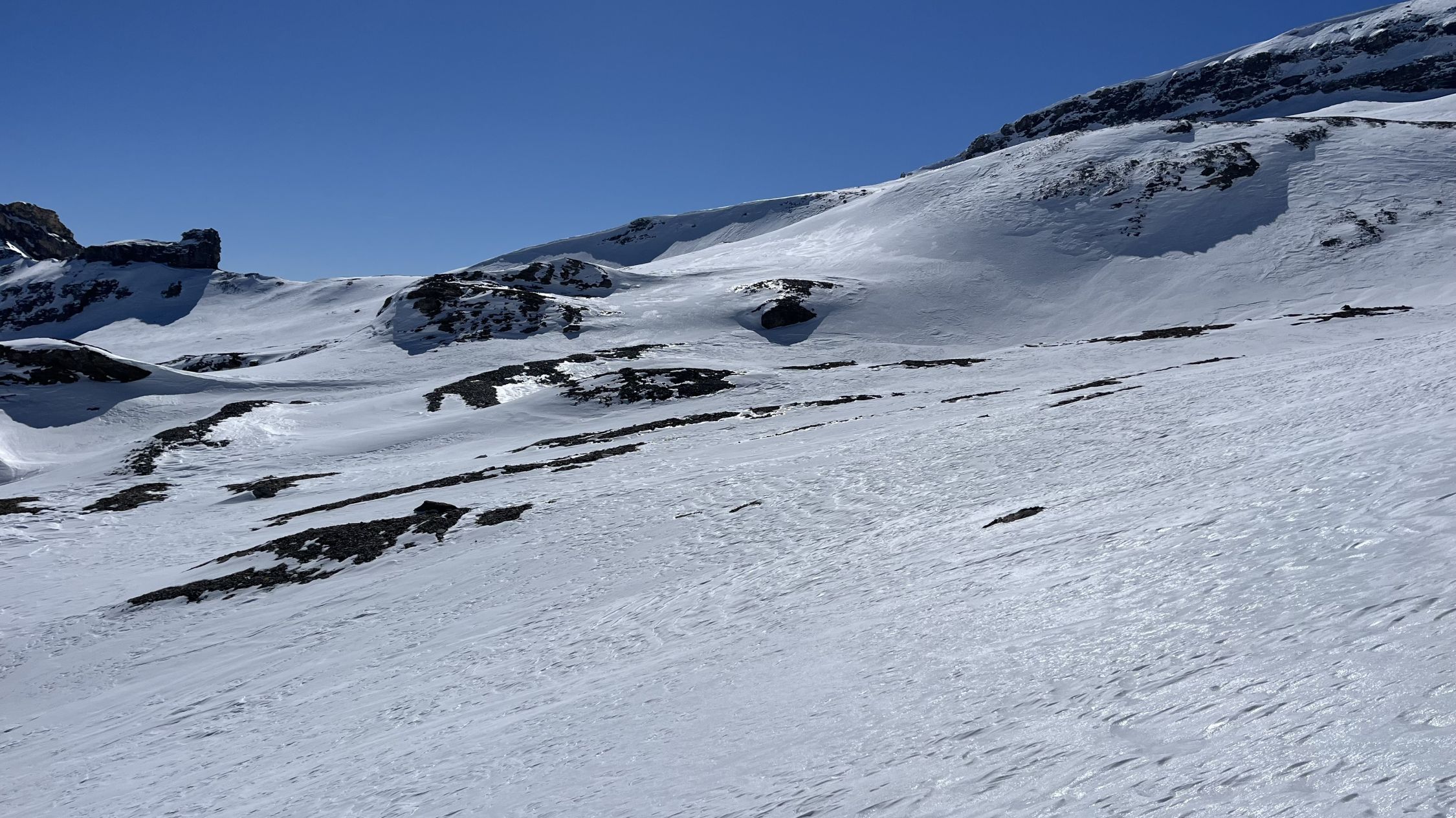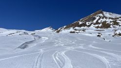 Nach dem Anfellen diesen folgend zeigte es sich, dass man etwas zu hoch herauskommt. Besser wäre, ganz unten hinein bis auf 2350 zu fahren und dafür ohne Querung firekt dem Bachlauf nach aufs erste Bödeli steige (ca 40 Hm).