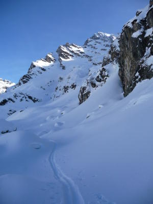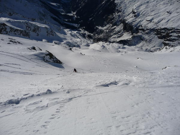 Abfahrt: Nach dem Couloir blieben keine Wünsche offen - viel unverspurter Pulver. Letzte 10m der exponierten Querung zur Bärenchälen durch Spuren stark erleichert, Chälen selber dann links eisig bzw. auf der rechten (Sonnen-)seite schon sehr weich.