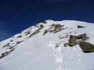 Aufstieg: bestens gespurt durch Touren am 1.2/3.2, jedoch teilweise zugeweht. Im Couloir mit Ski neu zu spuren, Gipfelhang sehr hart. S-Grat problemlos. Starker W-Wind am Gipfel
