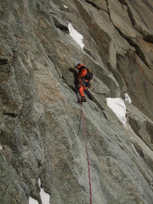 Den Einstieg kann man in zwei oder drei Längen klettern. Besser in zwei, dann hat man einen Bohrhakenstand. Danach sind es noch 7 Seillängen. Hoch und runter waren wir etwas mehr als 7,5h unterwegs. Standplätze bzw. Abseilstellen ok. Meist 3-4 Normalhaken mit mehreren Schlingen verbunden.