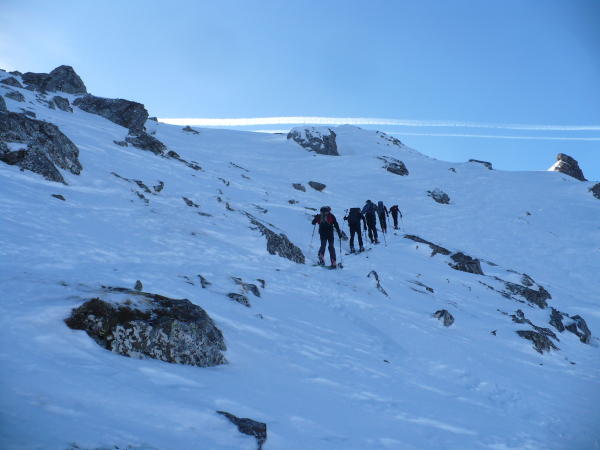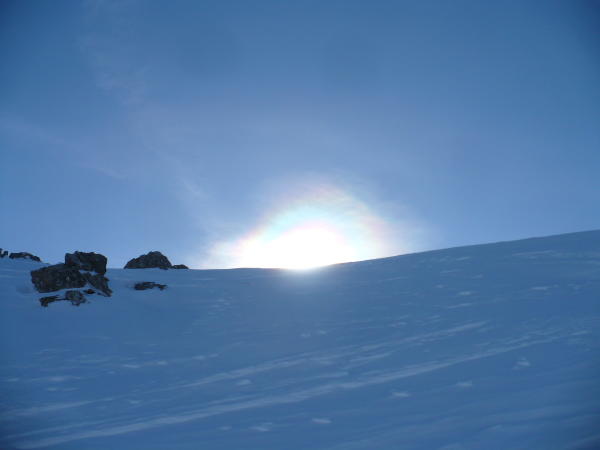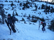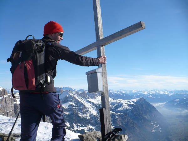 von Alt St. Johann über wenig Schnee zur Alpe hoch, Aufstieg Gipfelhang mit Harscheisen - harte Schneedecke, Windverblasen, beim Einstieg kurz die Ski abgeschnallt. Abfahrt problemlos möglich, flaches Stück entlang der Langlaufloipe und tolle Pistenabfahrt ins Tal