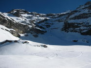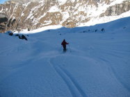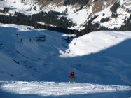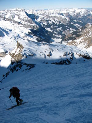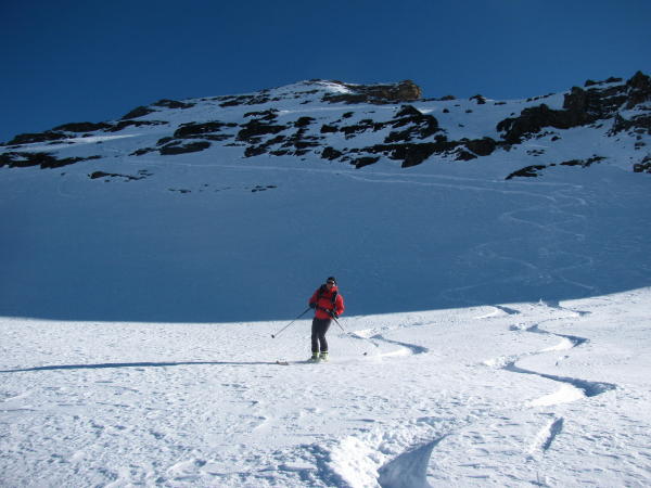 Hübscher Pulver bis 18oom. Pulver z.T. ohne Unterlage im Steilgelände führt zu Steinkontakten, aber grösstenteils gut umfahrbar. Aufstiegsspuren >2400m besser mit Harscheisen. Mit Skiern bis auf Gipfel möglich (steile Spitzkehren nötig).