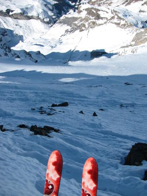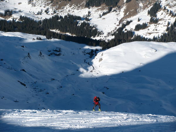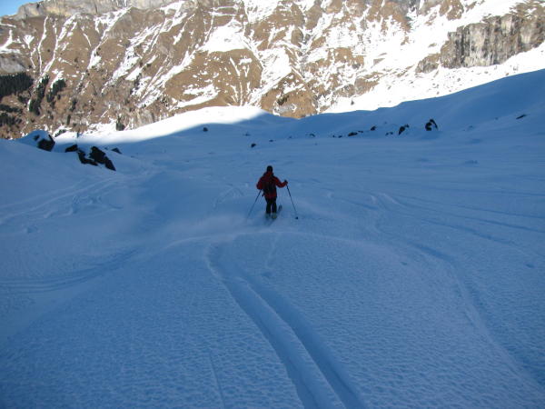 In der Steilabfahrt vom Hohtürli ist uns ein kleines Schneebrett im Steilgelände (ganz im Osten des Nordhanges) abgegangen (viel akkumulierter Pulver, der schon grobkörnig ist).