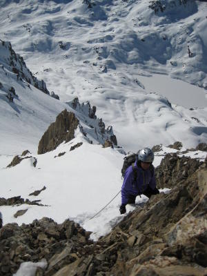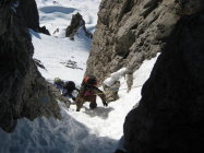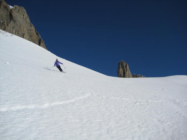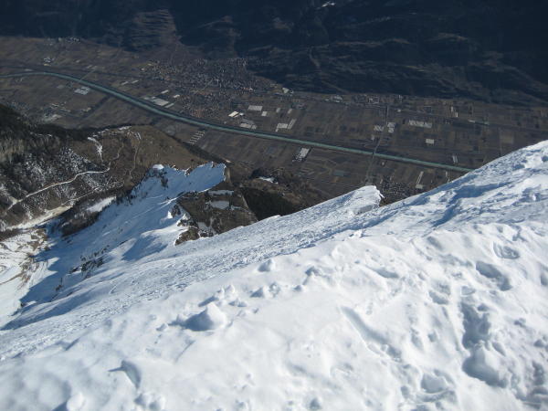Sehr schöne Trittschneeverhältnisse beim Aufstieg. Die Abfahrt über das Südostcouloir bietet noch gute Bedingungen, obwohl es schon recht viel befahren wurde.Die direkte Steilabfahrt vom Gipfel ist ebenfalls befahren worden.
