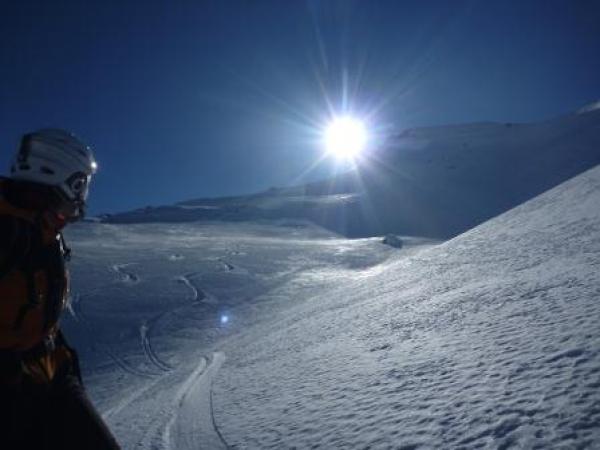 Im Aufstieg der Spur nach, in der Abfahrt im obersten drittel der Ostflanke aufgebauter Altschnee der sehr gut zu fahren ist und nach unten eine durchgehend tragende Firnflanke die ab und zu durchbricht. Die Ostflanke setzt sturzfreies fahren voraus sonst wird's gefährlich.