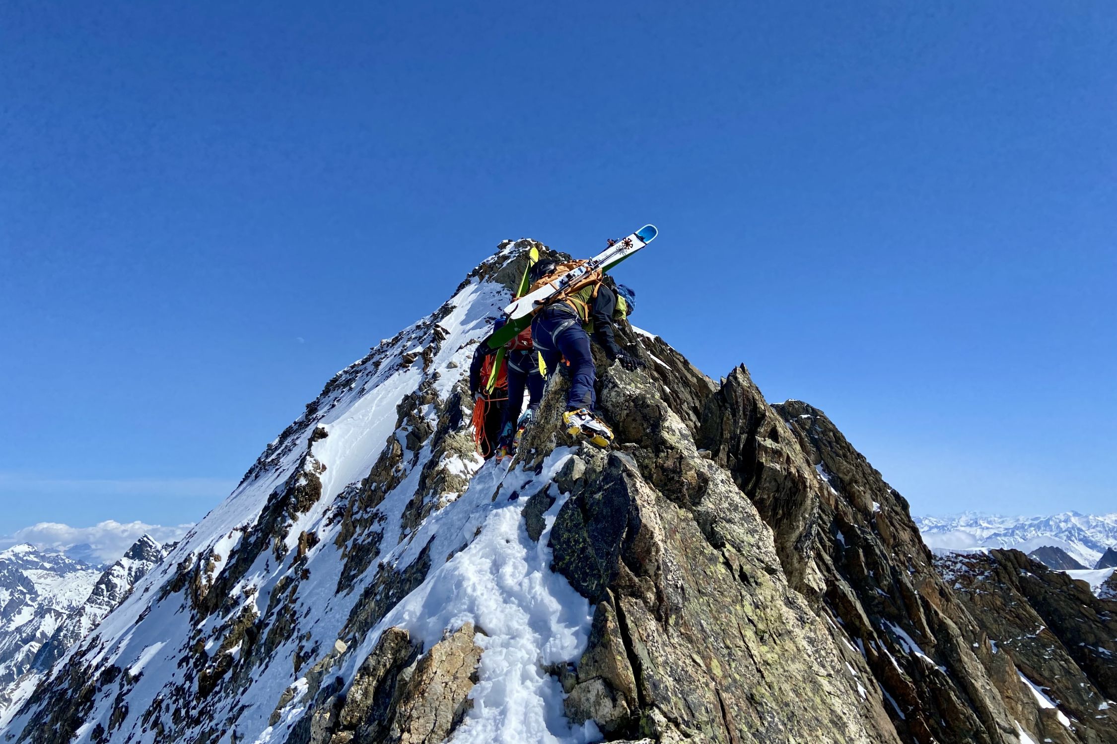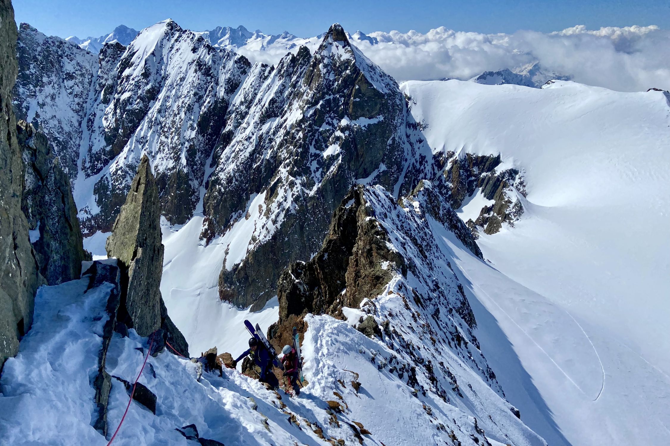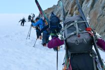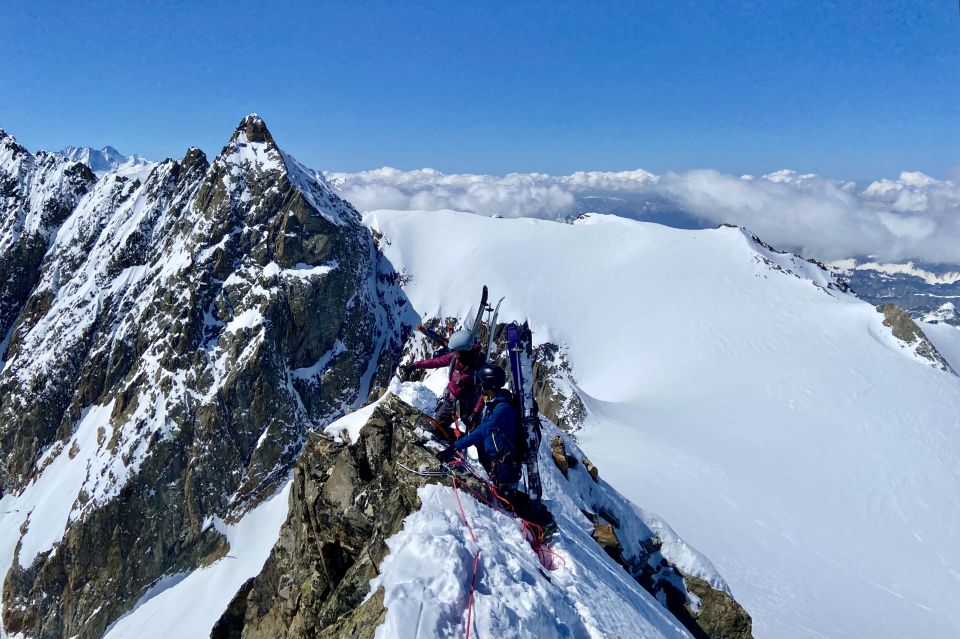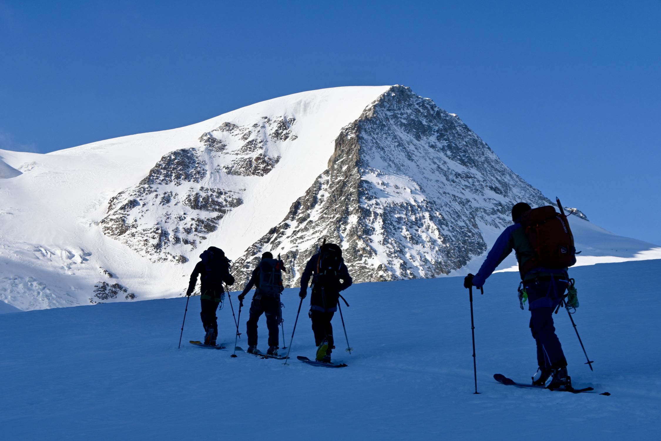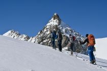Aufstieg: gute Abstrahlung trotz hoher Temperatur und ausreichend Schnee ab Steingletscher. Der Steilhang unter dem Gletscherbruch wird mittlerweile rechts zu Fuss aufgestiegen und war gestern noch ohne Steigeisen möglich. Dann über den Gletscher gute Bedinungen, mit Ski bis knapp unter den Grat (alte Route). Der Einstieg hoch zum Grat ist etwas vereist, auf dem Gart selbst dann gute Bedingungen. Sichern mit Schlingen und ein paar Friends gut möglich. Abfahrt Normalweg: oben hart, in der Mitte etwas Bruchharsch, unten (inkl. Steilhang) weich und teilweise Bremsschnee.