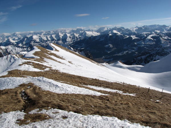Bürglen momentan von oben bis unten eine "normale" Skipiste. Pulver- oder unverspurte Hänge gibt es zur Zeit in diesem Gebiet nicht mehr. Auf den letzten 3 Metern vor dem Morgetepass Häuschen hat es eine Stelle mit Blankeis.