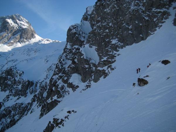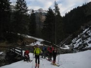 Im oberen Bereich beim Zustieg zum Bad Rotenbrunnen gab es längere Tragepassagen. Auch danach mussten die Schier gelegentlich getragten werden. Nach der Gadenalpe wird das Gelände zunehmend steiler. Unter dem Muttawangjoch waren die Harscheisen eine willkommene Hilfe auf der harten und glatten Spur. Zeitweise wurde eine neue Spur angelegt. Auch im oberen Bereich Richtung Gipfel mussten immer wieder abgewehte spiegelglatte Stellen überwunden werden.