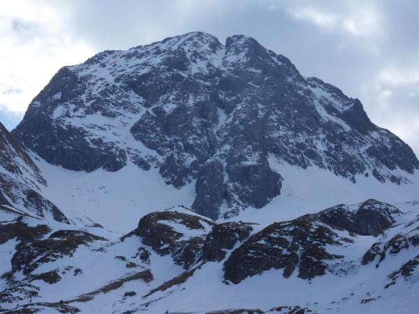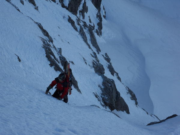 In der Einstiegsrinne schön harter Firn, weiter oben fast zu guter Trittschnee. Manchmal sehr loser Schnee auf Felsplatten. Die steileren Aufschwünge sind aber immer schön fest.