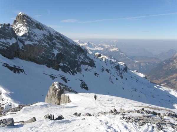 Grosse Schneemengen, sehr hart und somit für Schneeschuhgänger ideal . Nur an wenigen Stellen eingesunken, darunter Gries.
