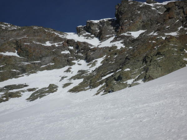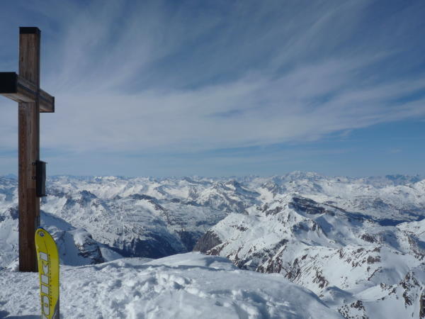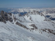 Wir sind die Westrinne zum Gipfel und die Südrinne wieder runter. Abfahrt durch die Südrinne geht im oberen und im unteren Drittel ganz gut, im mittleren Drittel schnallt man besser ab, da einige Felsbrocken lauern. Vom Grat nahe 3140m kann man mit Ski gut abrutschen, ohne die Spur zu zerstören. Vernünftig Skifahren kann man da zur Zeit m.E. aber nicht, da die Schneequalität grausig ist und man sich über den Felsabbrüchen keine Fehler erlauben kann. Der Rest der Abfahrt zum Auto war auch lausig, da wir recht spät dran waren. Man trifft fast alle Schneearten an, es gibt auch ein paar bodenlose Abschnitte, wo man bis zu den Felsen durchbrechen kann (die Skier blieben zum Glück unversehrt).