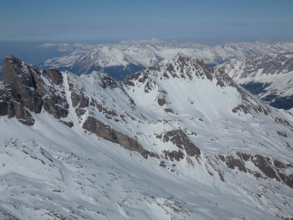 Es liegt noch knapp Schnee ab Pürd (nur ca. 20-30cm bis auf ca. 2200m). Wir haben im steilen Aufstieg zum Grat nahe P. 3140m den direkten Ausstieg gewählt, etwas heikel, deutlich leichter ist die nach links hochziehende Route, die wir für die Abfahrt bzw. den Abstieg gewählt haben.