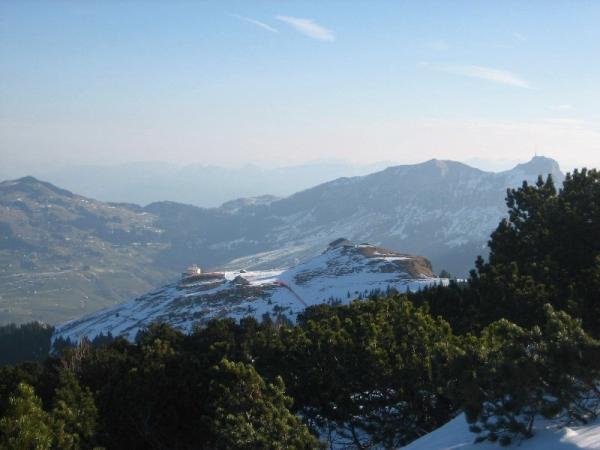 Wetter schön und mild. Schneelage im Tal mager. Schneeschuhe erst bei Eugst montiert. Um nicht die Skipiste bis zur Chlus begehen zu müssen, bin ich rechter Hand steil Richtung Chalberen aufgestiegen. Im Steilhang ist der Deckel eingebrochen,darunter schlechter Halt auf Pulverschnee. Oberhalb der Chlus ist der Sommerweg nicht zu erkennen. Route führt über einen schmalen Schneegrat zum (im Winter) geschlossenen Berggasthaus.