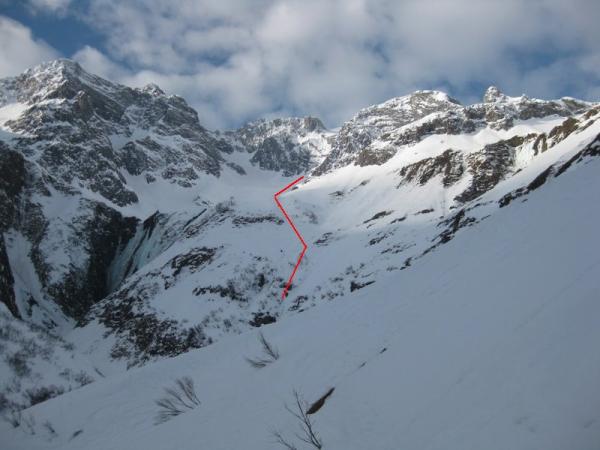 Oben Hartpulver (Triebschnee) und verblasene alte Spuren. Aufstieg durch die Rinne am Wasserfall sehr gut machbar.