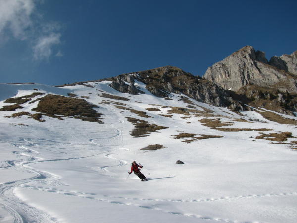 Hart in den Noraufstiegen, Pulver oder Sulz in der Abfahrt! 100m Tragstrecke kurz vor Hengstkurve auf Strässchen, ansonsten gerade genug Schnee, aber ohne Steinkontakt! Die steilen Nordhänge sind z.T. noch unverspurt und mit gutem Pulverschnee!