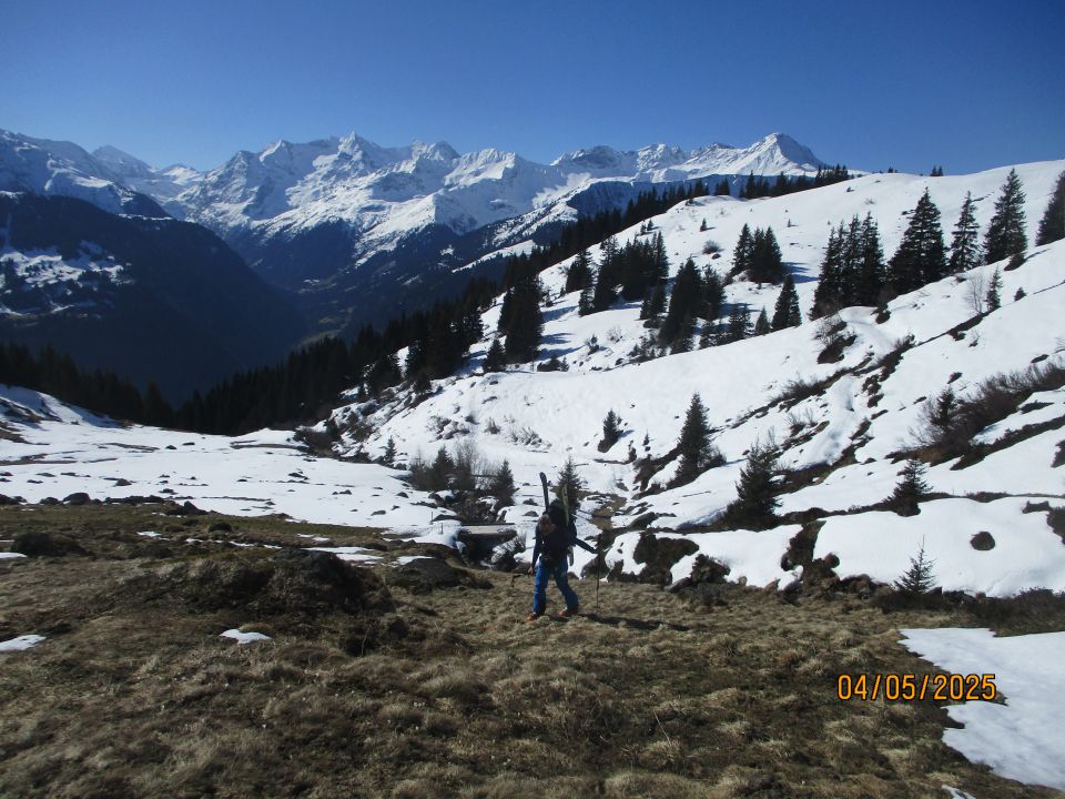 Der südseitige Abstieg von der Fuorcla Posta Biala ließ sich in griffigem Firn gut bewerkstelligen. Allerdings war ich durch meine Verletzung gehandicapt und brauchte für den Abstieg verhältnismäßig lang. Somit wurden die letzten ca. 300 hm (zwischen ca. 2100 und 1800 m) zum Fluch, da die Schneedecke nicht mehr richtig trug. Unter 1800 war es überwiegend aper. Stefan und Björn auf Skiern hatten ausgezeichnete Abfahrtsbedingungen ab der Fuorcla. Die Abfahrt am Samstag Nachmittag gen Osten zur Hütte hingegen fand aufgrund des Harschdeckels wenig Gefallen.