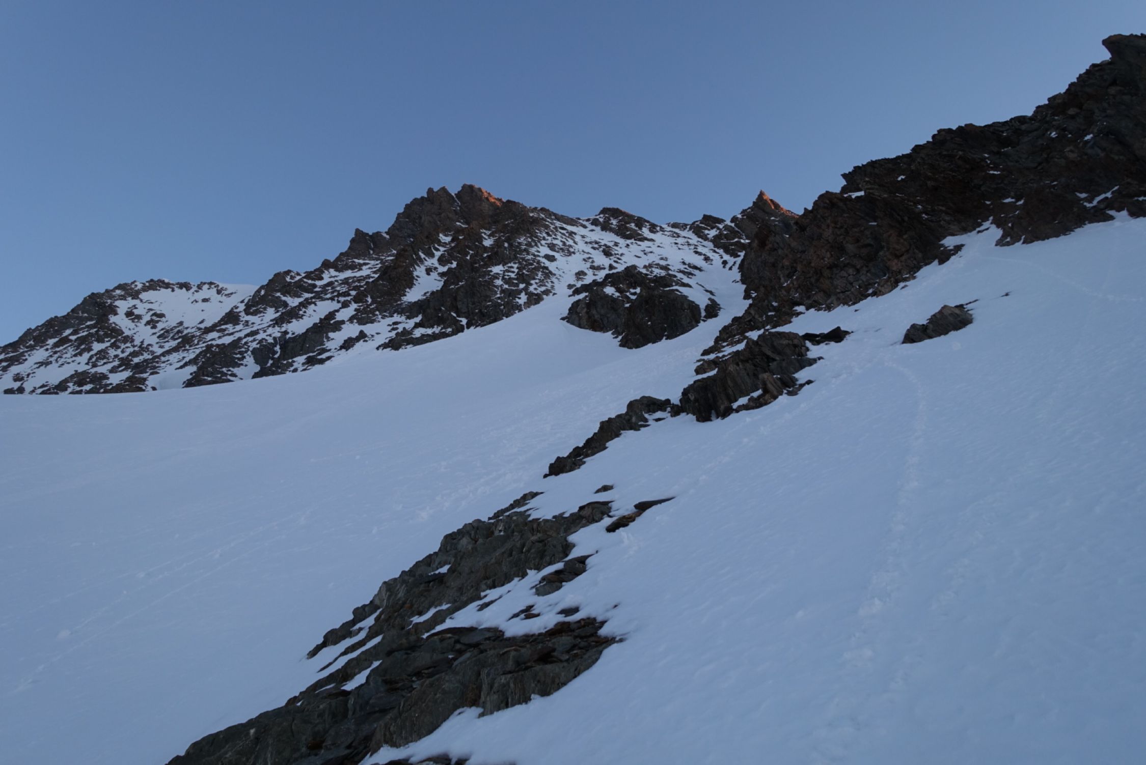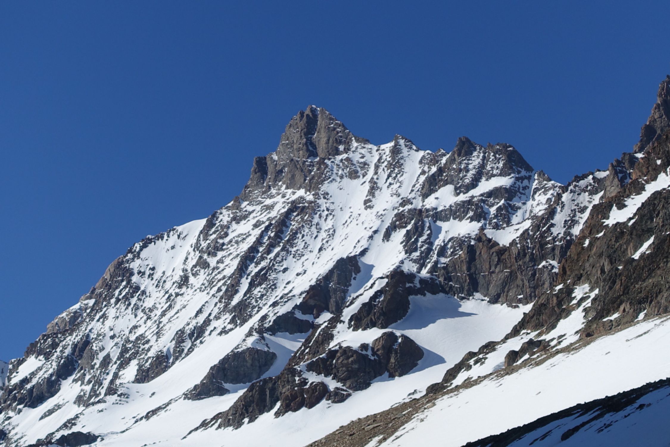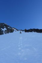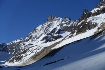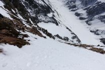 Wenig Schnee im Couloir (s. Fotos), Tour war aber trotzdem gut machbar (besser als der Anblick von weitem vermuten liess). Auffahrt bis zur Staumauer Räterichsbodensee möglich. Strasse ab dort gesperrt, aber geräumt. Ca. 2 km Ski tragen, aktuell kann ab ca. 100 hm vor der Staumauer Grimselsee bis zum Aarbiwak mit Ski gegangen werden. Grimselsee z. Zt. ohne Wasser, so dass direkt hindurchgequert werden kann. Schrägaufstieg in das Couloir durch die Flanke (ab ca. 2.800 m Höhe, wie in der Beschreibung). Auch wenn es mittendrin nicht so aussieht, findet sich entlang der Route ein Weg durch die Felsen. Querung in das eigentliche Couloir knapp unterhalb 3.300 m Höhe, Felsen können hier mit kurzem Abschnallen problemlos passiert werden (s. Foto). Von dort in mehr oder weniger gerader Linie zum Ausstieg auf 3.900 m. Gipfelgrat mit Steigeisen. Kleiner Gendarm konnte im Firn umgangen werden (etwas heikel, aber m. E. noch OK). Abfahrt ca. 12:30 Uhr gut aufgefirnt und super zum Fahren (aber Achtung auf Steine, die vereinzelt herausschauen können, sowie Steinschlaggefahr im Couloir, da man sich lange in der Falllinie bewegt und wenig Schnee liegt). Rückkehr am gleichen Tag zum Räterichsbodensee (nochmals ca. 4,5 Std.). Entgegen unseren Befürchtungen war der Schnee auch am Nachmittag noch nicht sumpfig, so dass die Abfahrt und auch das Gehen im flachen Teil problemlos war.