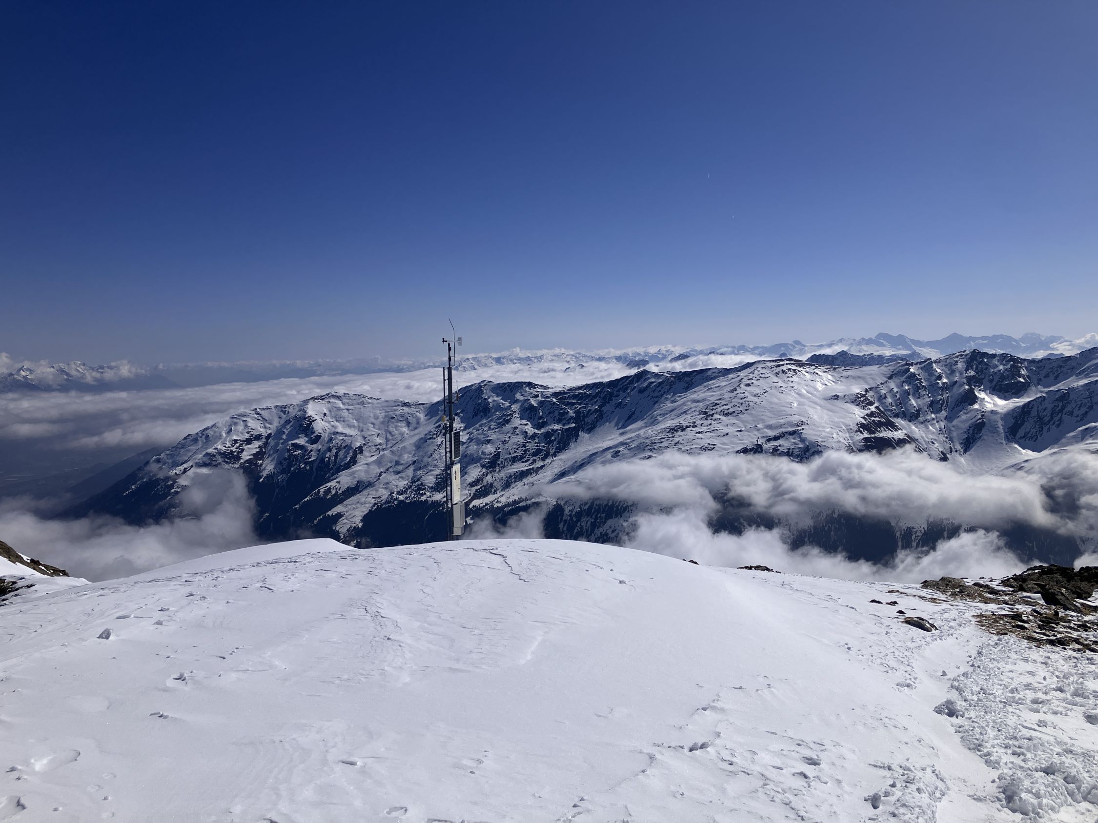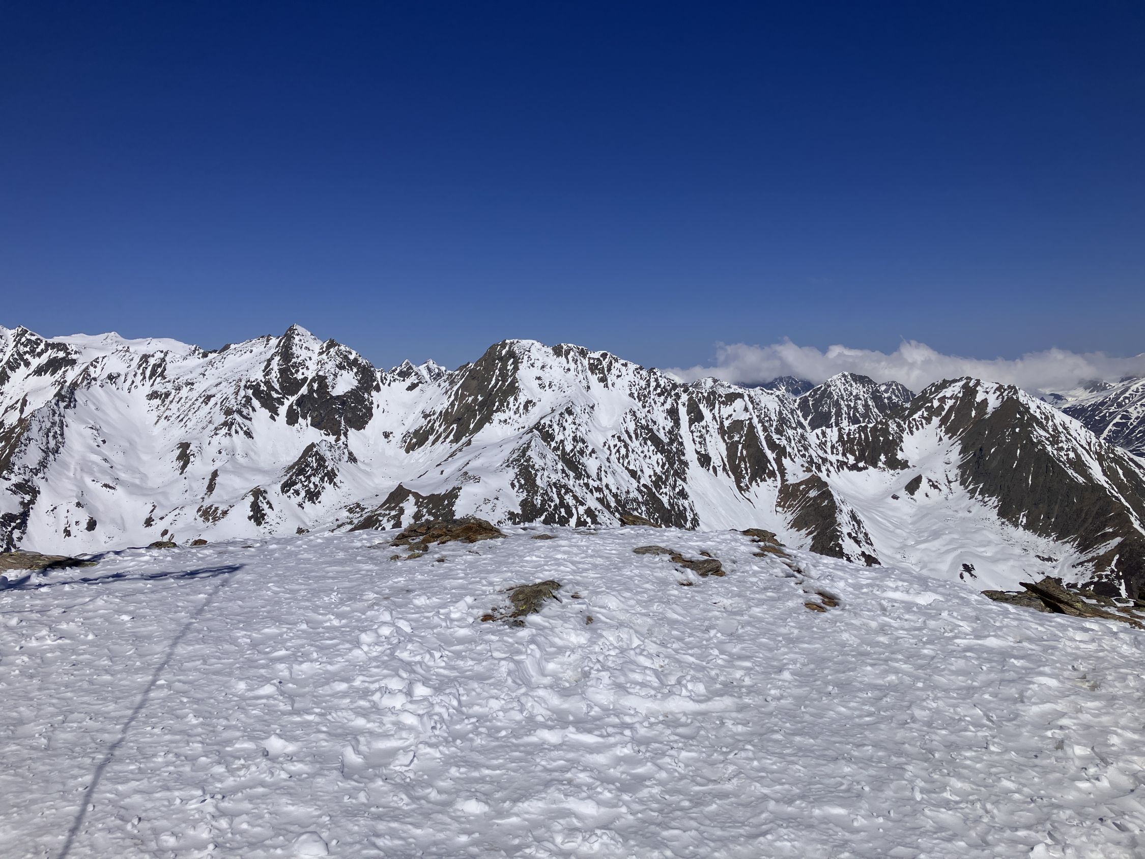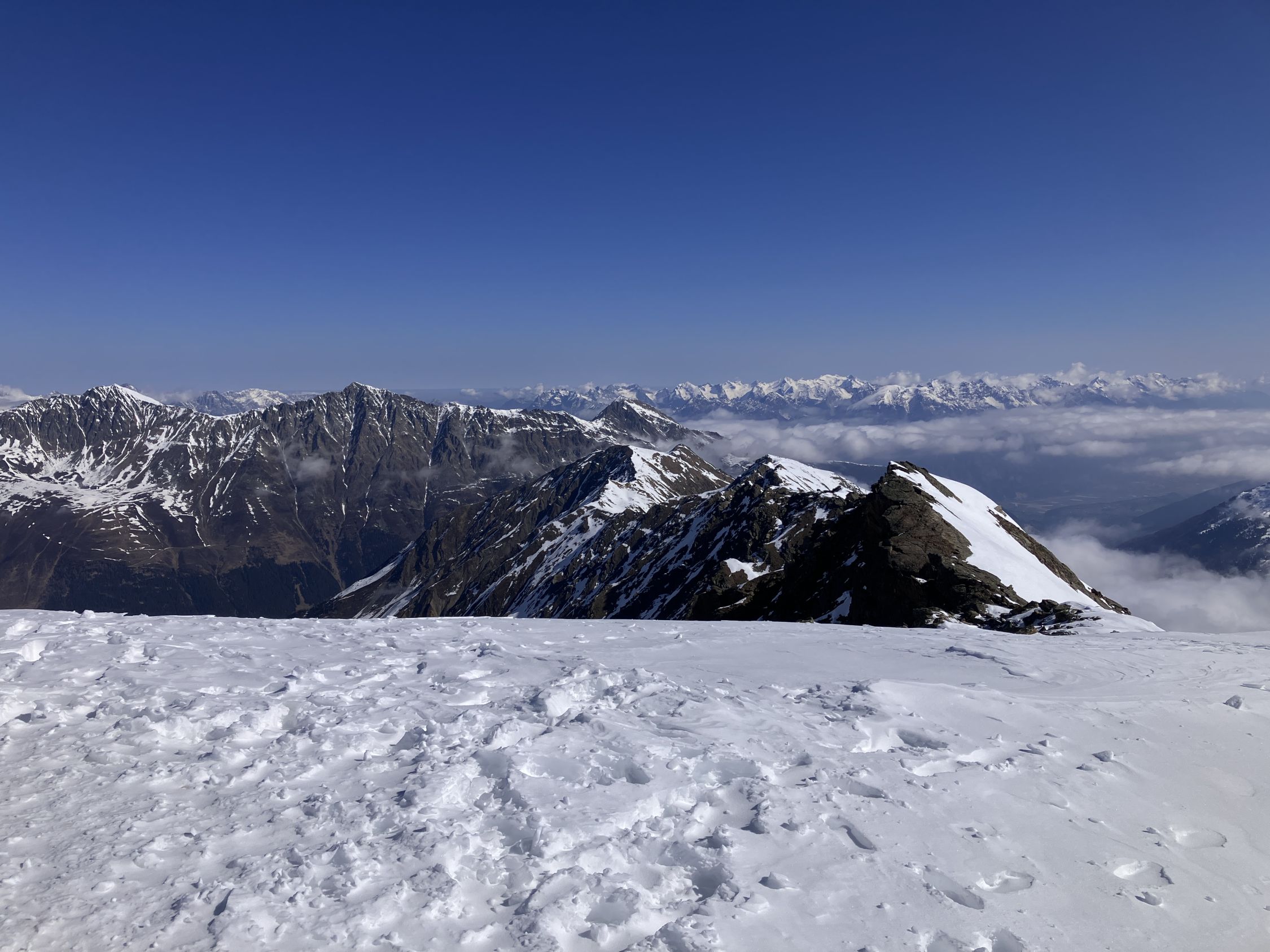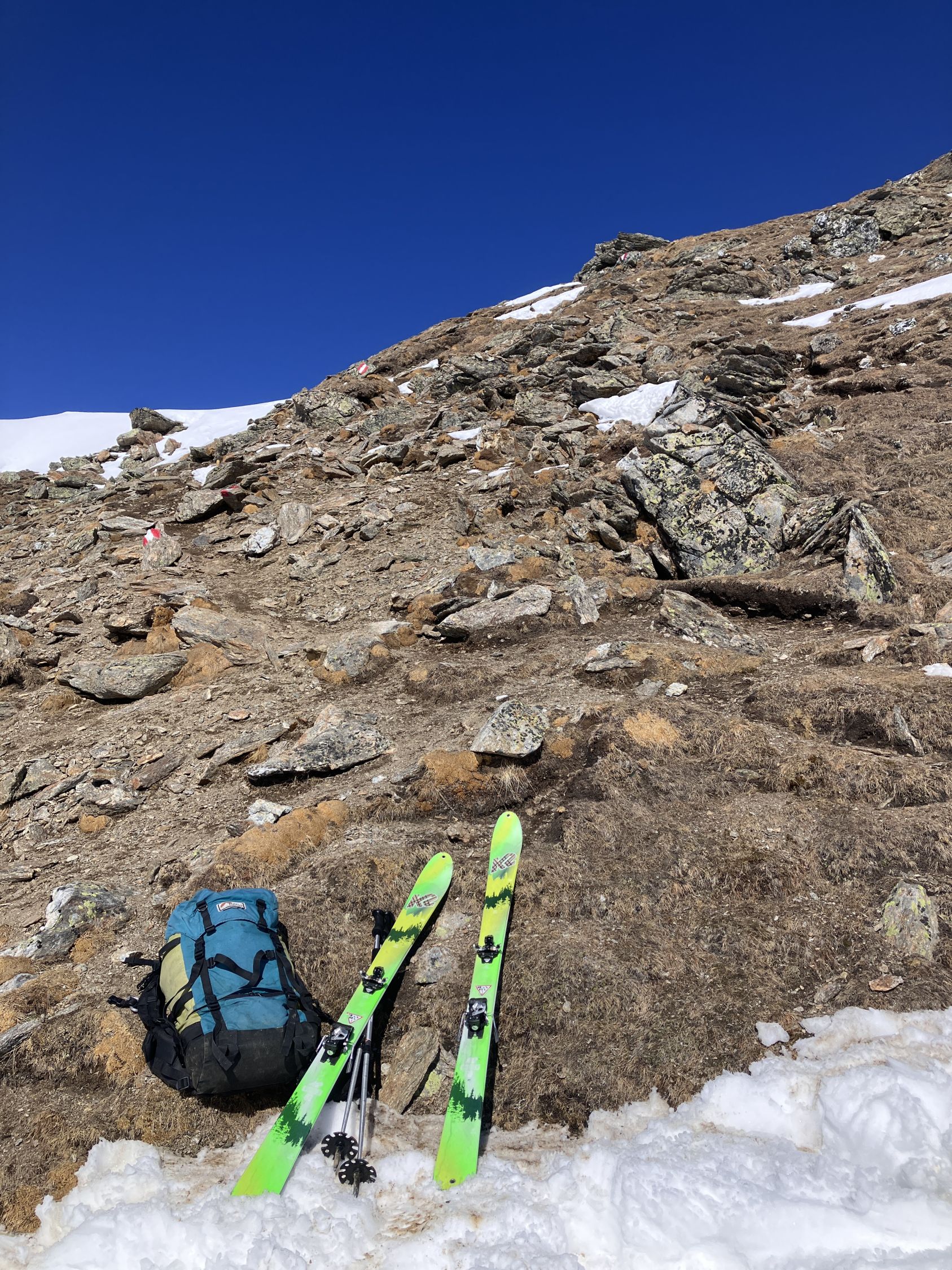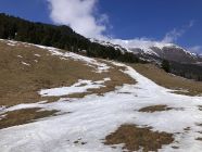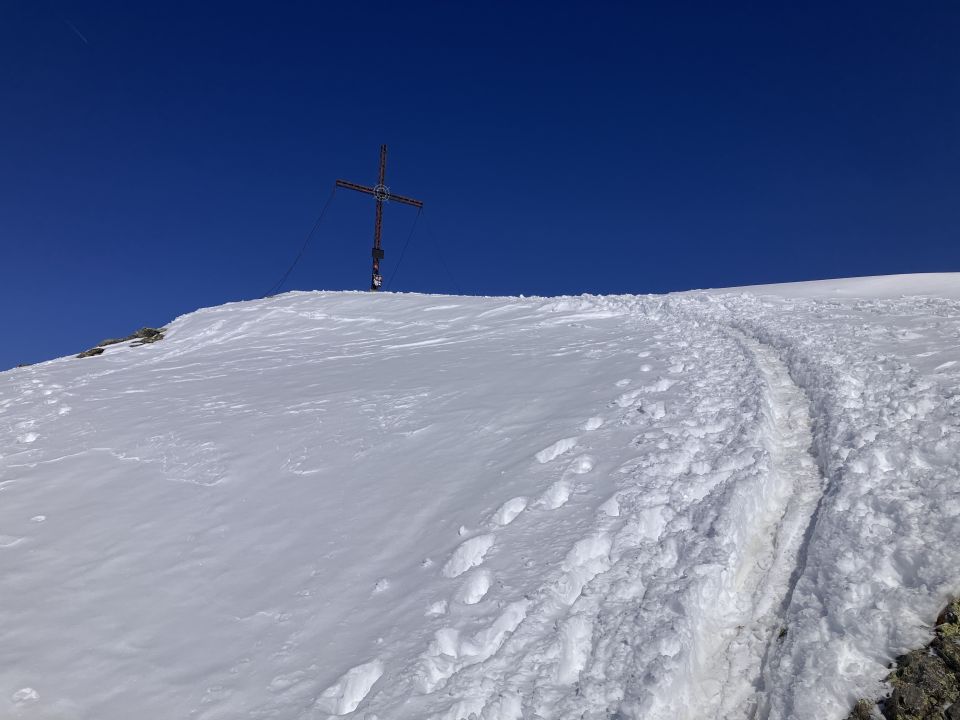 5 min oberhalb des Parkplatzes können die Skis montiert werden, danach nur eine kurze Tragepassage. Ansonsten Aufstieg sehr gut zu gehen. Gipfelanstieg bis auf das letzte Stück so gut wie aper.