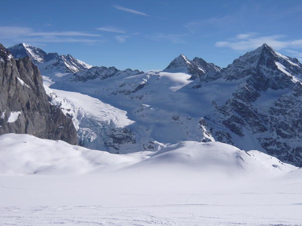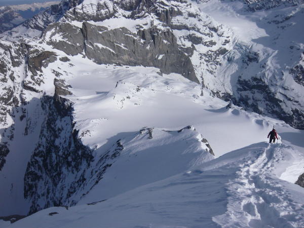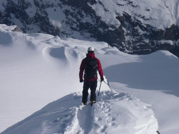 Hart, aber griffig, teils Steine. Ab Skidepot zwischen Fels und Schnee zum Gipfelgrat, der gut ausgetreten ist.