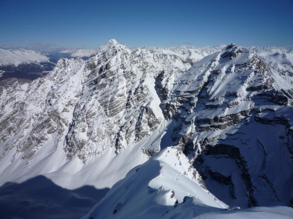 Abfahrtsverhältnisse: Man konnte wenige Meter unterhalb des Gipfels losfahren. Im WSW-Couloir schöner Powder auf harter Unterlage bis ca. 2800m, dann bis 2650m auf wechselhafter Unterlage. Abfahrt von der Fuorcla da Trigl: Hier hatte es weniger Neuschnee, trotzdem war die Abfahrt in teilweise altem aufbauend umgewandelten Pulver bis ca. 2200 gut. Im und neben dem Grava d' Laisch seltsame Mischung aus Uraltpulver und Harsch, zumindest passabel zu fahren. Der Waldweg war gespurt.