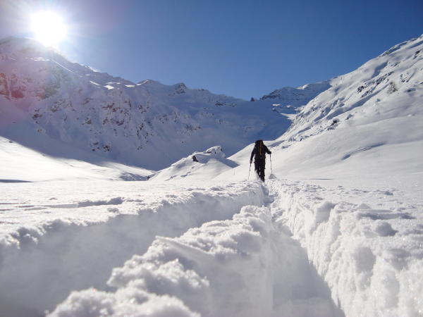 Durch die erhebliche Menge an Pulver war harte Spurarbeit angesagt. Preis-Leistung wurde nicht gebührend belohnt, Vadret Tremoggia zu flach und zu viel Pulverschnee um schwungvoll ins Tal zu gleiten. Ein paar schöne Schwünge gab es aber zum Schluss doch noch.