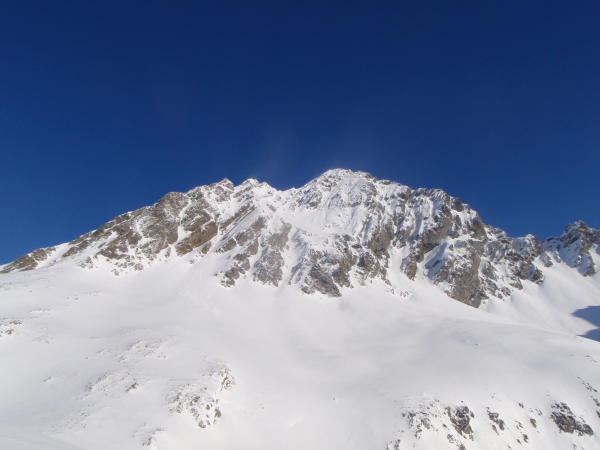 Nur im Schneefeld und am Gipfelgrat fanden wir relativ tiefen Schnee vor (knietiefes Einsinken).