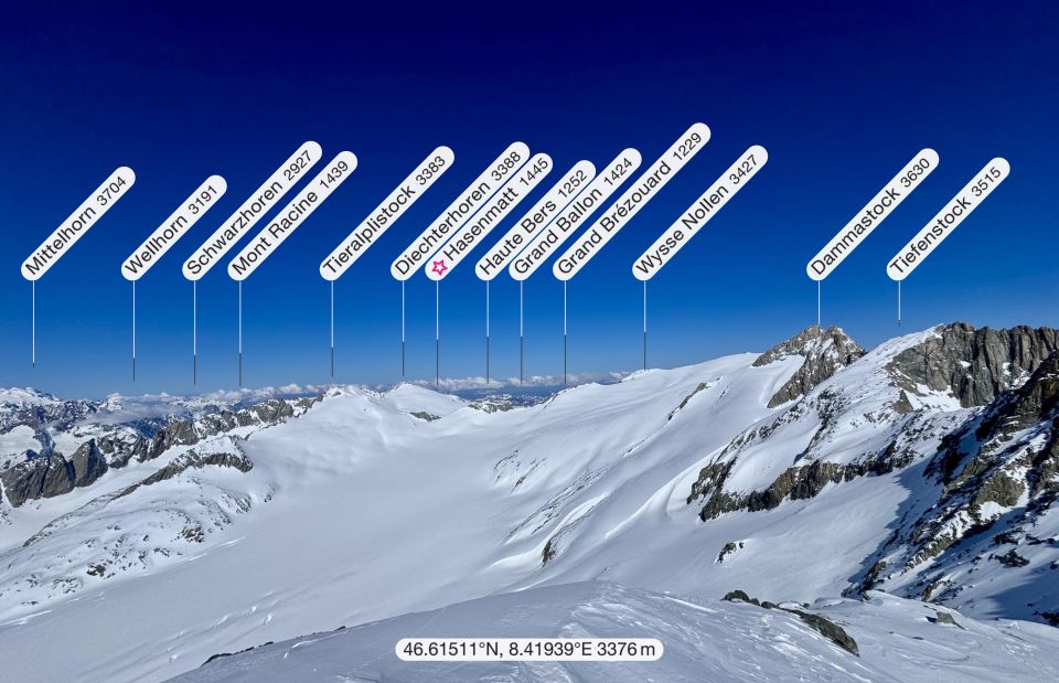Aufstieg durch das Schnee-Couloir etwas südlich des original Aufstiegs. Original Aufstieg (SAC-Tourenportal) über die Leiter unter dem Punkt 3419 quer hochsteigen waren keine Spuren vorhanden. Vermutlich werde diese Route nur im Sommer oder bei zu wenig Schnee verwendet.
