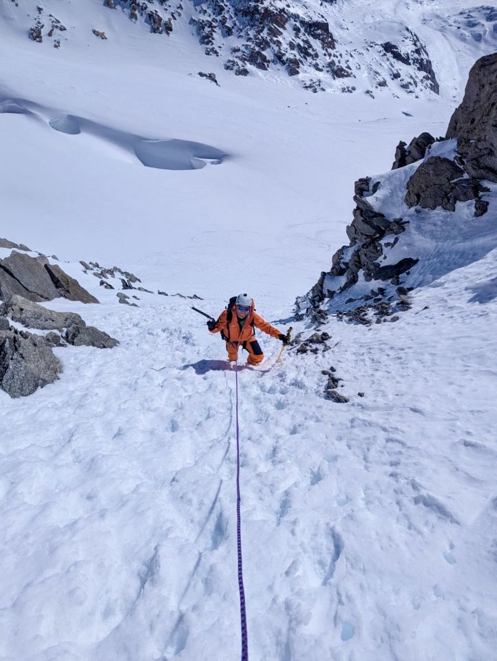 Schneedecke auf dem Gletscher war hart und ca 2m dick (laut WhiteRisk), wir verzichteten auf Seilsicherung auf dem Gletscher.