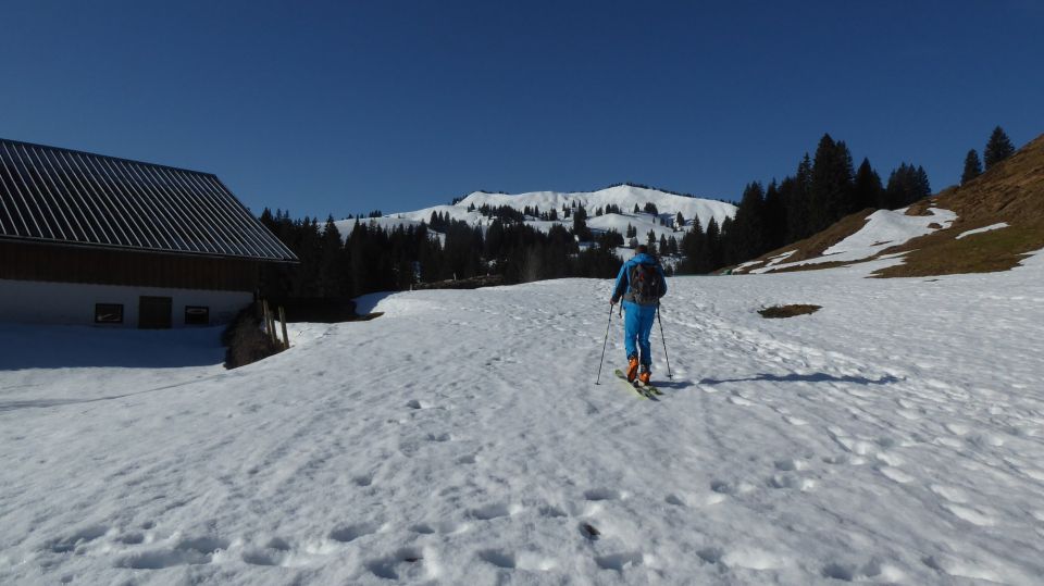 Kaiserwetter und heute ohne die kalte Bise von gestern. Mautstrasse hat noch Wintersperre ist aber bis kurz nach Stubenbachalpe frei. Dann wechselnd Altschnee und aper bis zur Einmündung Rappengschwend. Kurz vor Unt. Wilhelmine Alp dann durchgehende am Morgen auch tragende, reichliche Decke bis Gipfel. Abfahrt um Mittag oben Top Verhältnisse (Firn), auch mal abseitig hart, aber alles bestens, unerwartet gut.