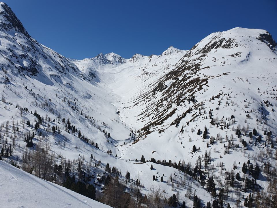 Weiter auf einer guten Spur im Sulzschnee dem Wanderweg folgend hinein in die Valle Vago bis zur Abzweigung von Val Nera und Val di Campo (bei P2196). Hier nur zwei schwache Aufstiegsspuren gesehen, die jedoch für den Gebrauch zu glasig waren. Nun auf griffigem, aber nicht aufgesulztem Schnee steil hoch in NE-Richtung bis das Gelände wieder etwas freundlicher wird. Über zwei Mulden weiter hoch und links ausholend zum W-Grat der Corna di Capra. Nun nochmals steil hoch auf einer ausgeprägteren glasigen Spur mit Ski bis zum Gipfel.