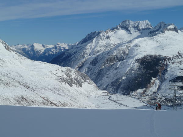 Das gute Wetter konnten wir im Aufstieg ausnützen und genossen die warme Sonne.Die Schneeverhältnisse waren recht gut,von Pulverschnee bis zu Windharst haben wir alles angetroffen, doch war der Schnee gut zum befahren. Am Gipfelgrat hat es nicht zuviel Schnee und der Fels zeigte sich stellenweise, so das die letzten Meter nicht für alle ohne Steigeisen zu machen waren.Die Abfahrt konnten wir jedoch direkt vom Gipfel Richtung Osten starten.Es waren etwa 40 Leute am Berg unterwegs.